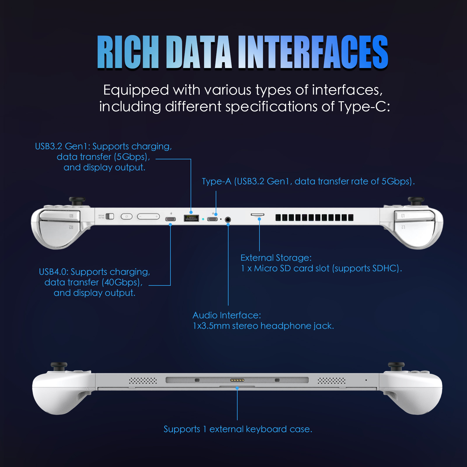 The device comes with a comprehensive set of IO ports. It has two USB4.0 ports, one USB3.2 port, a 3.5 – mm audio jack, a TF card slot, and a Pogo key board port. This variety of ports allows for easy connection of external devices such as mice, keyboards, and external storage drives.