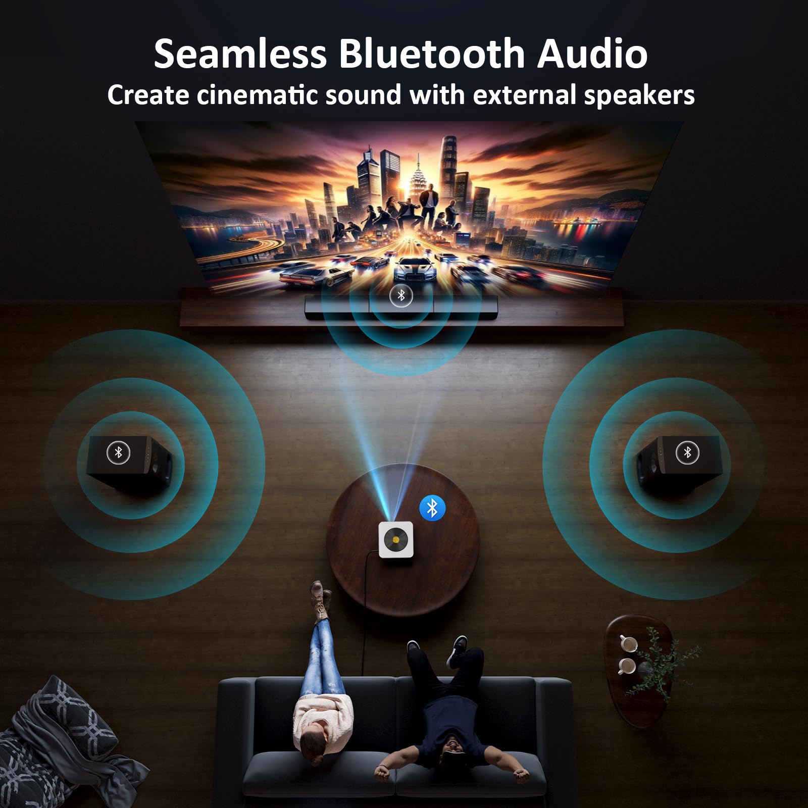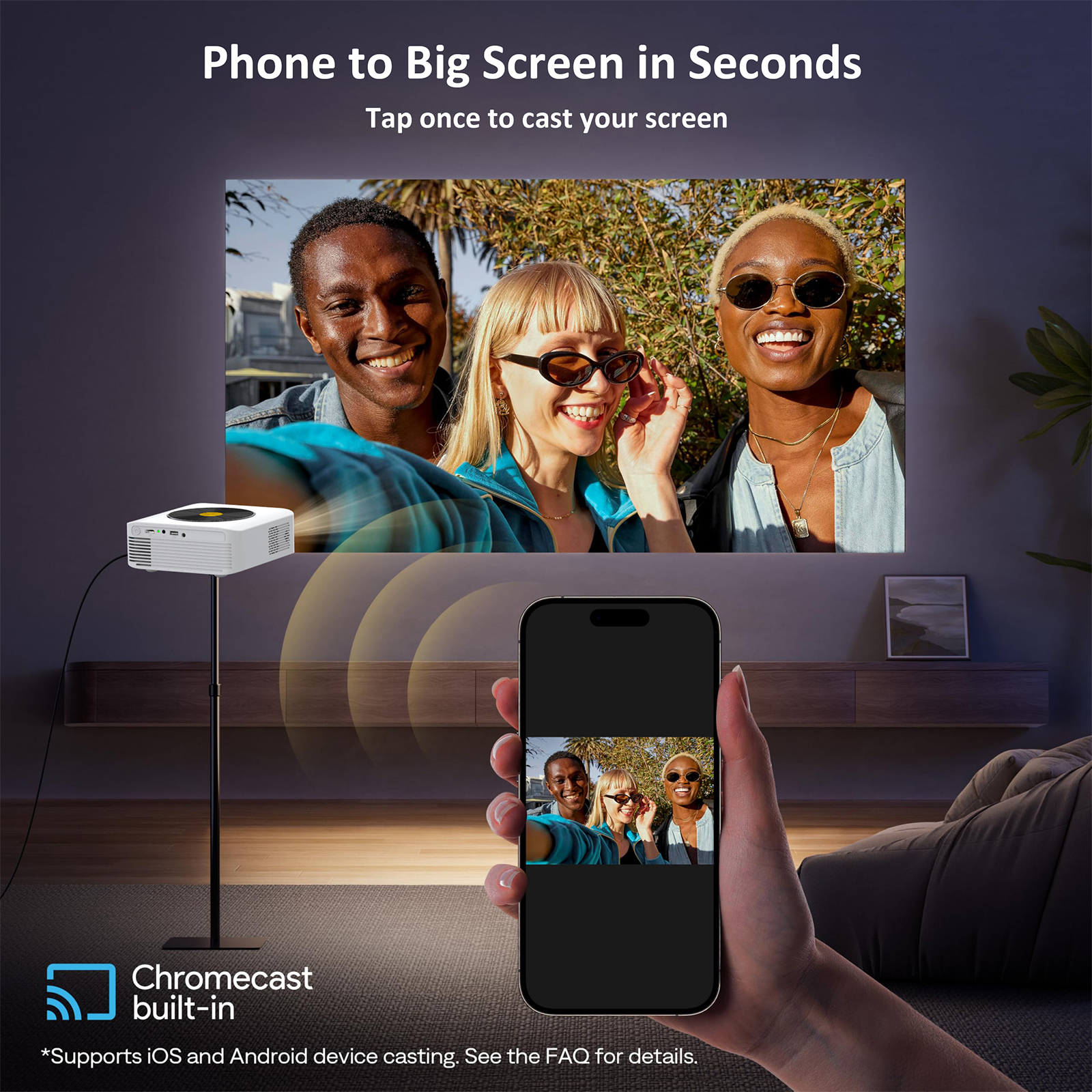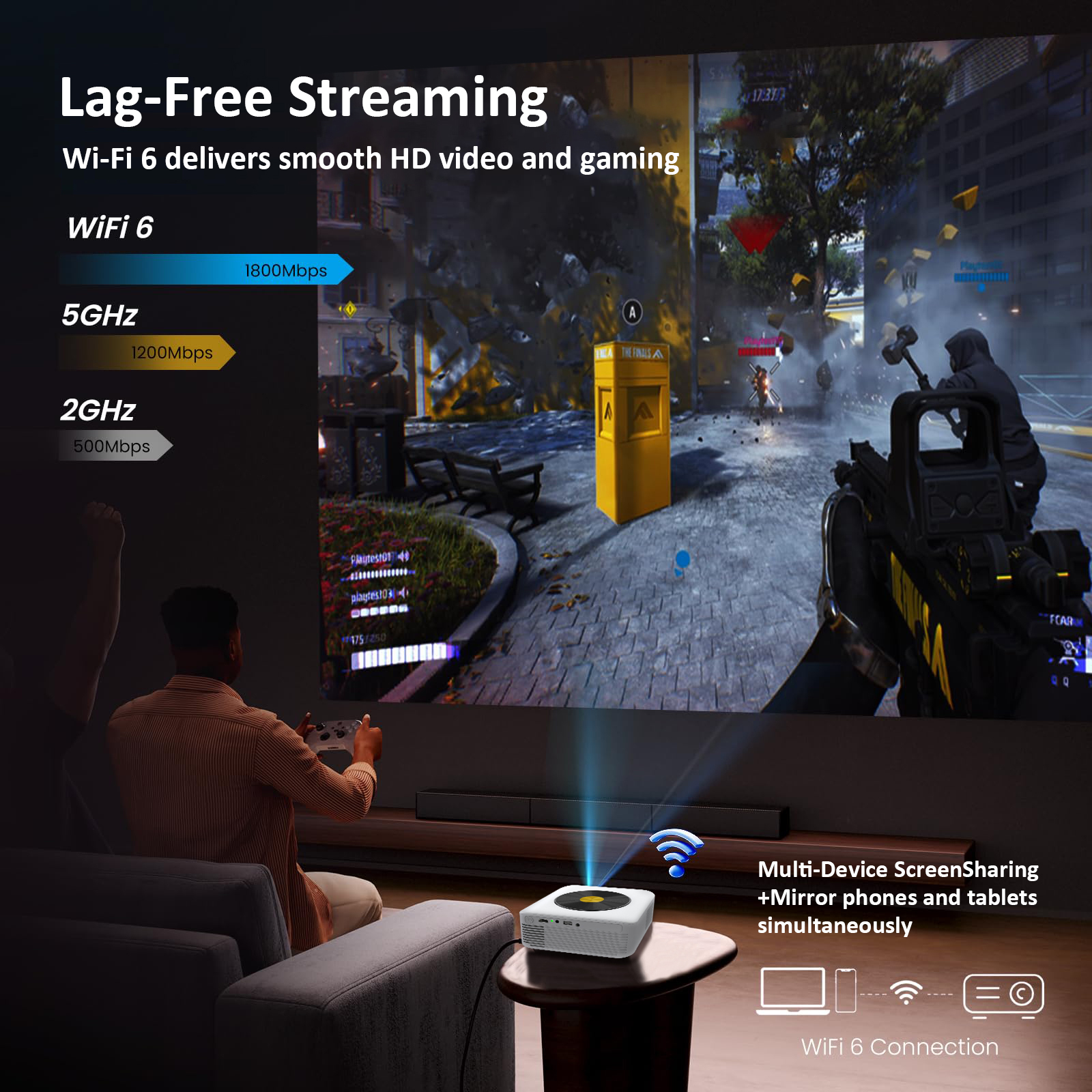 - Smart WiFi 6 & Bluetooth Projector – Dual-Band Wireless Streaming – Enjoy lag-free streaming as a WiFi Projector with dual-band WiFi 6 (5GHz/2.4GHz). Cast content wirelessly from iOS, Android, or Windows 10 via Screen Sharing, Miracast, or apps. Perfect for Outdoor Movie Projector nights or transforming any room into a cinema.