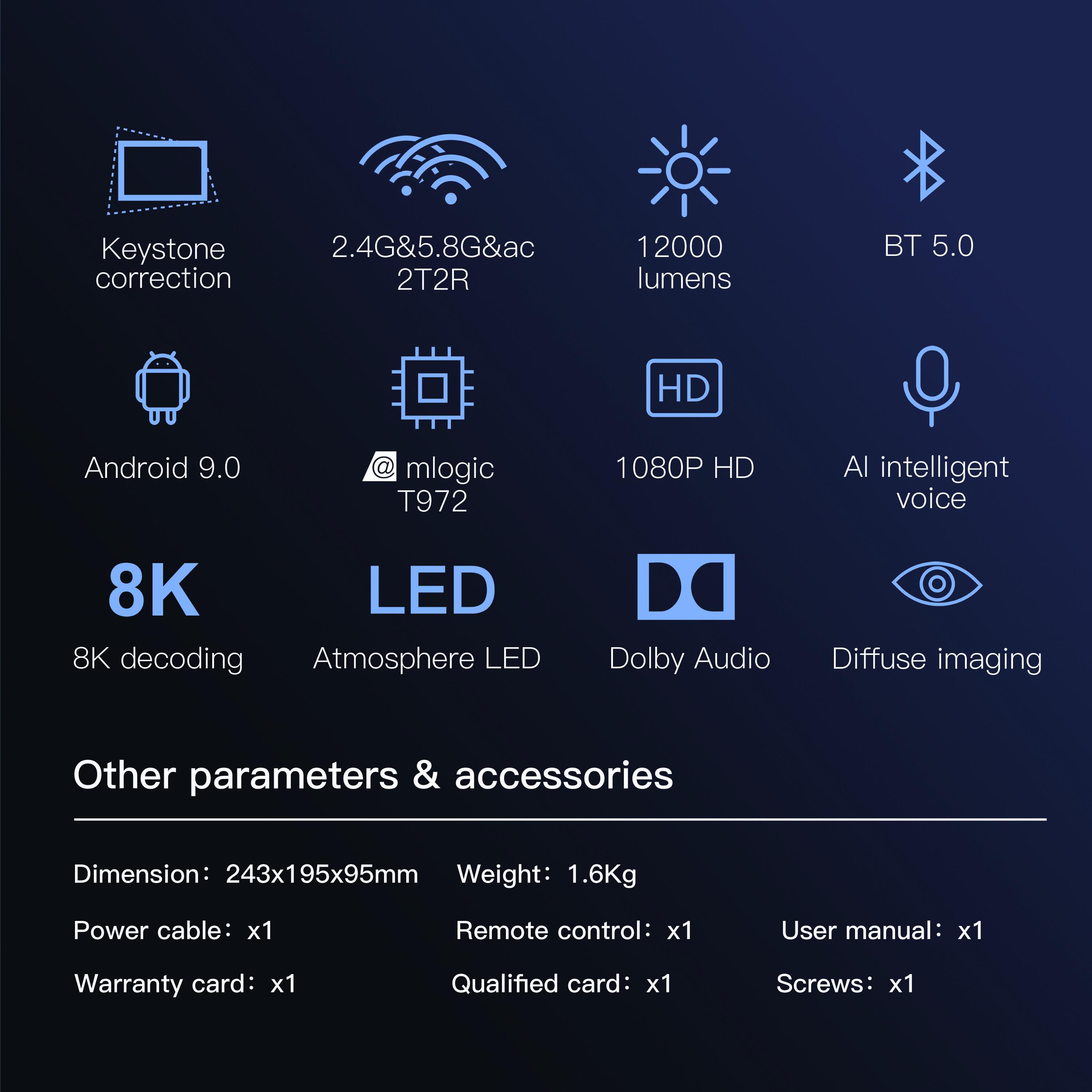 Feature highlights: New X1 4K Smart Projector with Quad-Core Android 9.0, 5G WiFi, and full HD 1080P resolution. Featuring a brightness of 230 ANSI lumens, Amlogic T972 CPU, Mali-G31 MP2 GPU, 2GB RAM, and 16GB ROM for seamless performance. Enjoy smart wireless screen projection, electronic keystone correction, and support for 8K/4K video playback. Compact and portable design with low noise at 42dB, making it ideal for home theater, business, education, and outdoor use.