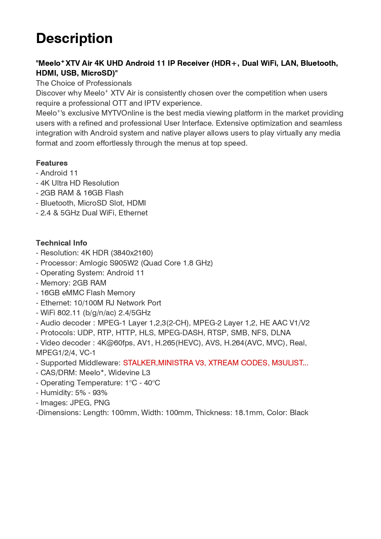 Experience professional OTT and TV performance with the Meelo+XTV Air TV Box, featuring a 2GB RAM and 16GB ROM for media playback. Equipped with Android 11 and Amlogic S905W2 processor, it supports 4K resolution, HDR+, dual WiFi, LAN, BT, USB, and MicroSD. Extensive optimization ensures effortless navigation and compatibility with virtually any media format.